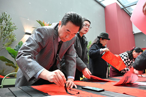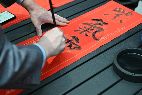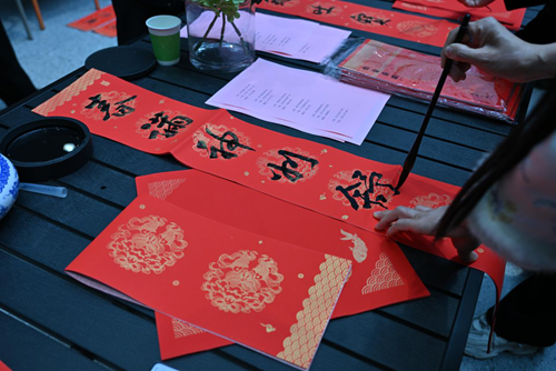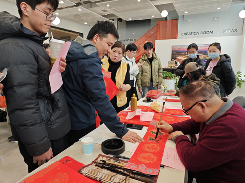 活動當(dāng)天,鄭州市文聯(lián)的書法家們受邀來到現(xiàn)場。他們個(gè)個(gè)精神飽滿,手執(zhí)毛筆,在一張張紅紙上揮灑自如,書寫著寓意深遠(yuǎn)的新年序言。這些序言既是對過去一年的總結(jié),也是對新年的美好期許。書法家們的精彩表演贏得了現(xiàn)場觀眾的連連稱贊,租戶們紛紛表示:“書法家們寫的字真是太好了!‘福’字看著就喜慶,春聯(lián)的寓意也都非常美好。”