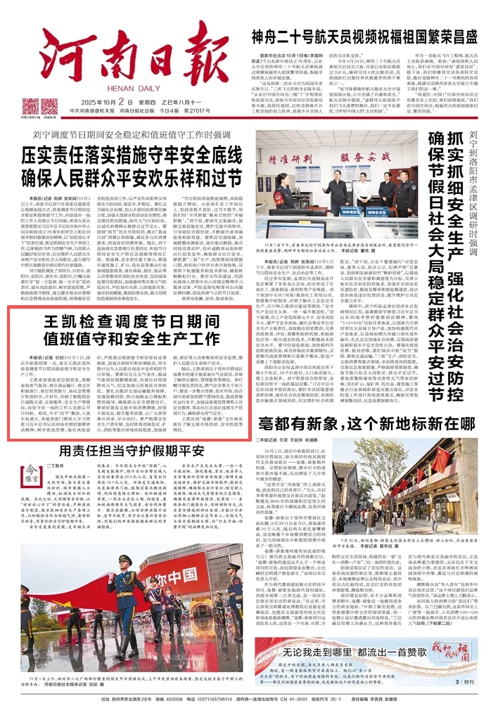 王凱來到省政府總值班室,視頻連線省氣象局、省交通運輸廳、省文化和旅游廳、省自然資源廳、省應急管理廳和洛陽市、開封市,詳細了解假期首日道路交通、文旅服務、安全生產(chǎn)等情況,向堅守在一線的工作人員致以節(jié)日問候。他說,今年“雙節(jié)”疊加,人流車流量大,各地各部門要深入學習貫徹習近平總書記在河南考察時重要講話精神,樹牢底線思維,強化風險意識,嚴格落實值班值守和信息報送等制度,加強會商研判和協(xié)調(diào)聯(lián)動,用辛勤付出為人民群眾創(chuàng)造平安祥和的節(jié)日環(huán)境。要密切關(guān)注天氣變化,提高氣象預報預警精準度,有效應對持續(xù)降雨天氣,切實加強山洪地質(zhì)災害防范。要扎實做好交通運輸服務保障,加強高峰時段、熱點線路運力調(diào)配和管控疏導,確保群眾安全便捷出行。要更好激發(fā)文旅市場消費潛能,持續(xù)豐富業(yè)態(tài),提升服務質(zhì)量,讓廣大游客乘興而來、盡興而歸。要嚴格落實安全生產(chǎn)責任制,及時排查消除危化、礦山、消防等重點領域風險隱患,加強商超、景區(qū)等人員密集場所安全監(jiān)管,維護人民群眾生命財產(chǎn)安全。
