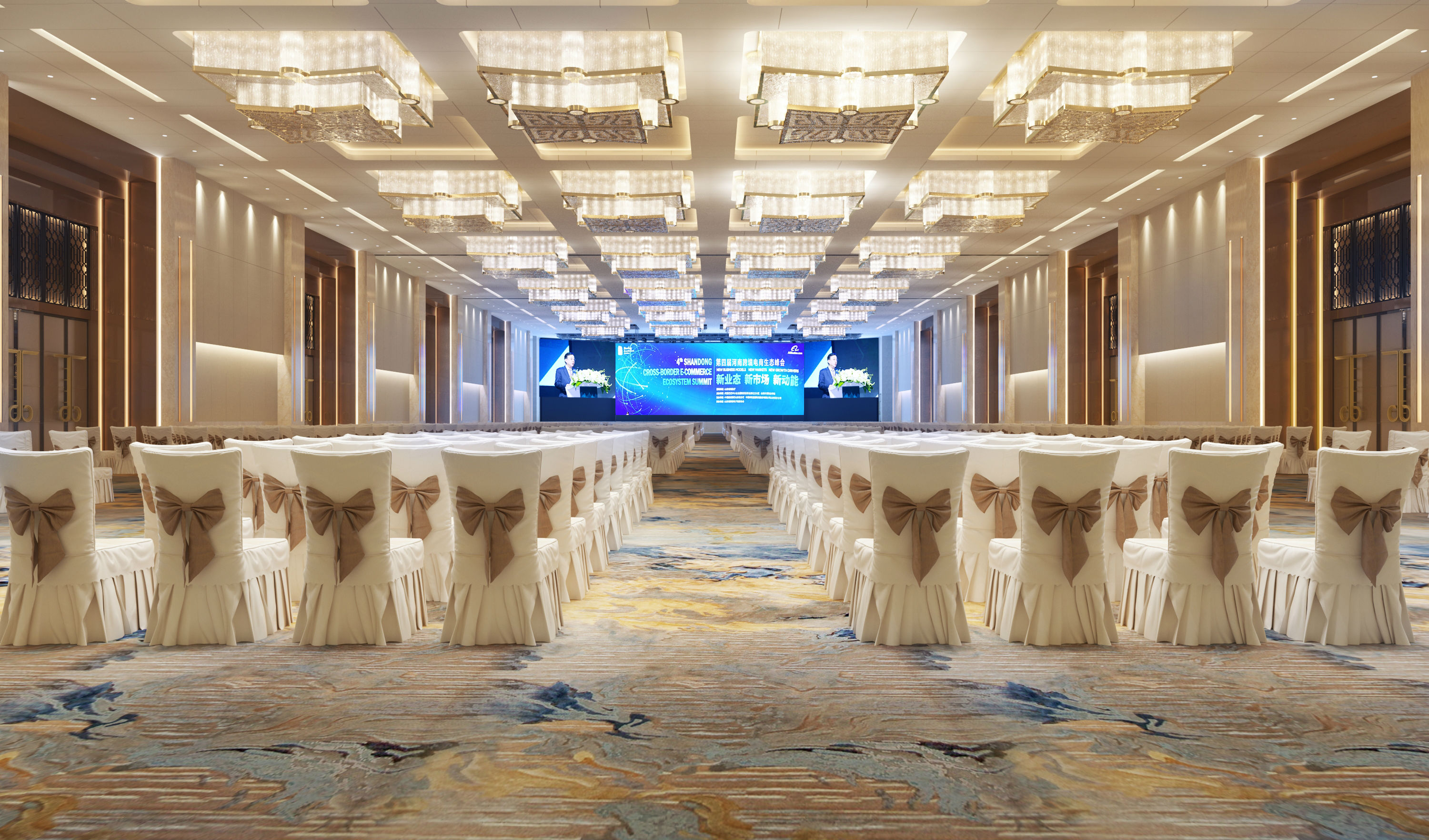 奧體中心展覽廳位于鄭州市奧林匹克體育中心游泳館下方,緊鄰鄭州“四個中心”中央大街,總建筑面積約8500平方米,包含3000平方米展覽廳、大堂前廳、設(shè)備房等配套設(shè)施工程。項(xiàng)目整體設(shè)計(jì)理念取“黃河天水”及“商合”之意,采用了大量的“黃河”及“商都”兩大彰顯地域特色的設(shè)計(jì)元素,表現(xiàn)出韻味十足的鄭州商都文化特色,同時又兼具現(xiàn)代會展會務(wù)的簡約風(fēng)格。