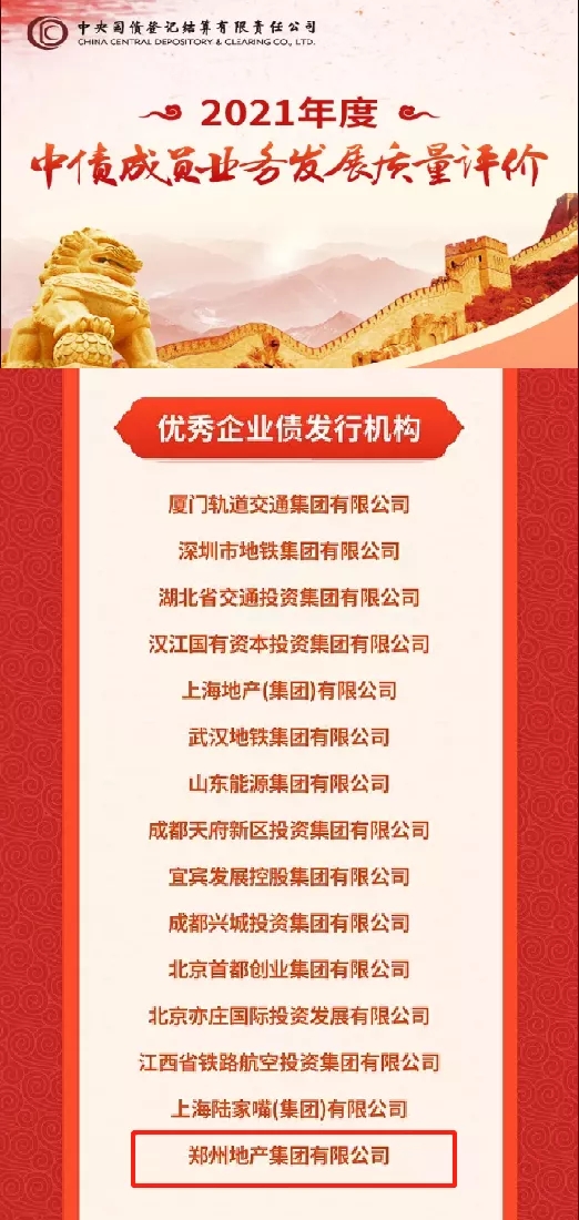 2022年1月4日,鄭州地產(chǎn)集團(tuán)獲評中央國債登記結(jié)算有限責(zé)任公司(以下簡稱中央結(jié)算公司)發(fā)布的2021年度中債成員業(yè)務(wù)發(fā)展質(zhì)量評價(jià)“優(yōu)秀企業(yè)債發(fā)行機(jī)構(gòu)”。